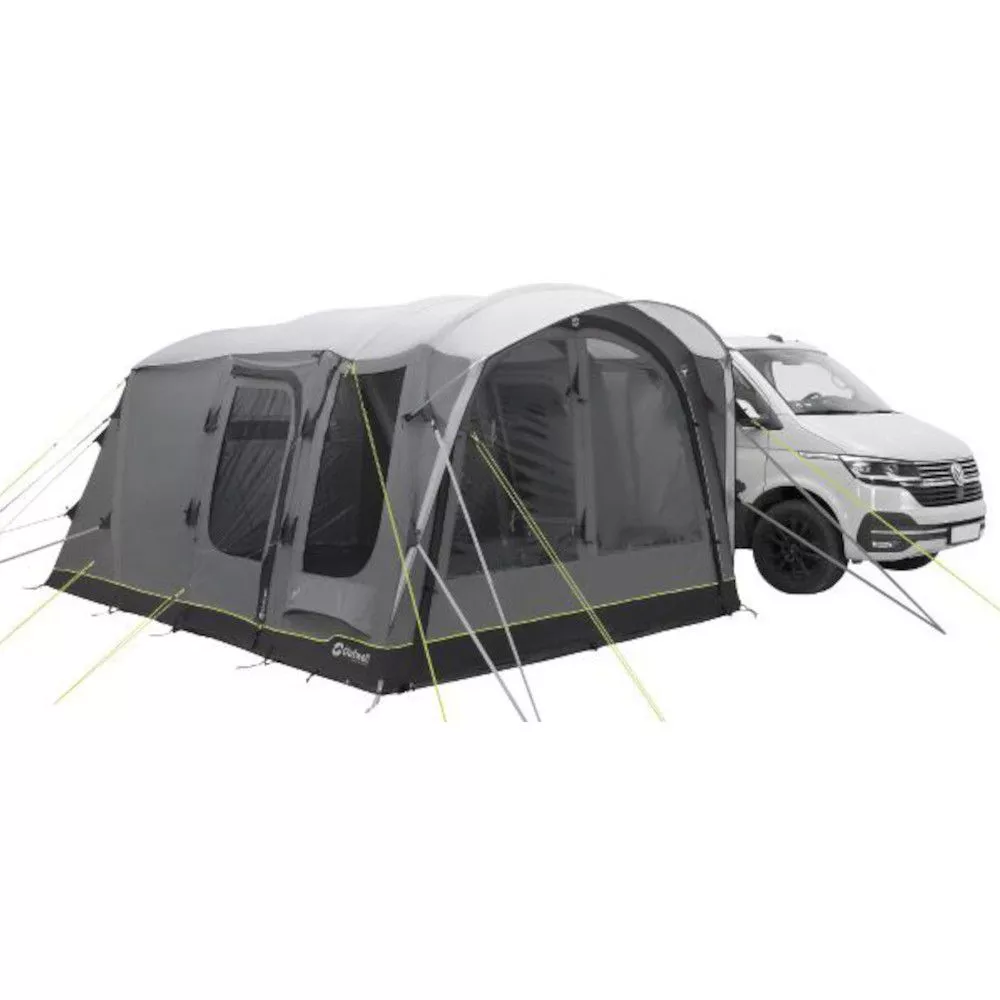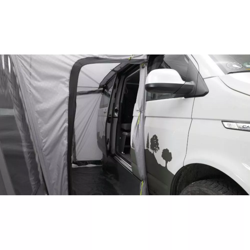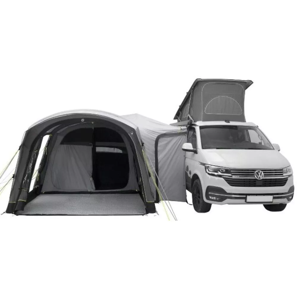 Das Outwell Wolfburg 450 Air ist ein freistehendes, aufblasbares Vorzelt, das parallel zum Bus steht. Trotz der schönen Grösse benötigt es gemeinsam mit dem Bus nur eine recht geringe Stellfläche.