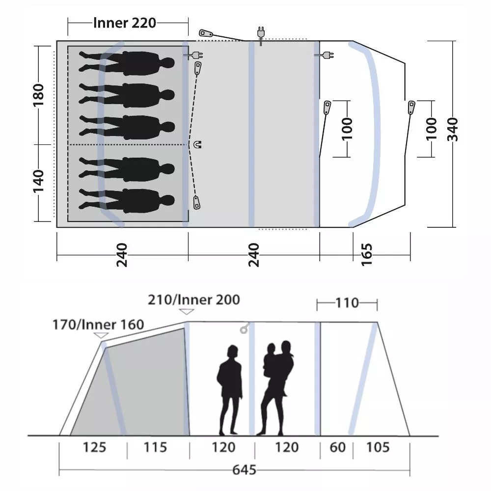 Der als Zubehör erhältliche, passgenau zugeschnittene Teppich sorgt für noch mehr Komfort. Und die passgenaue Unterlage schützt den Zeltboden vor Abrieb und Schäden von unten und isoliert gleichzeitig gegen Bodenkälte. Erweitere das Tennessee 5 Air mit dem optional erhältlichen Outwell Canopy Tarp L und erhalte so noch mehr wettergeschützten Platz. Der ebenfalls zusätzlich erhältliche Outwell Lounge L Tent Connector ermöglicht es dir, dein Zelt mit einem Outwell-Pavillon zu verbinden.