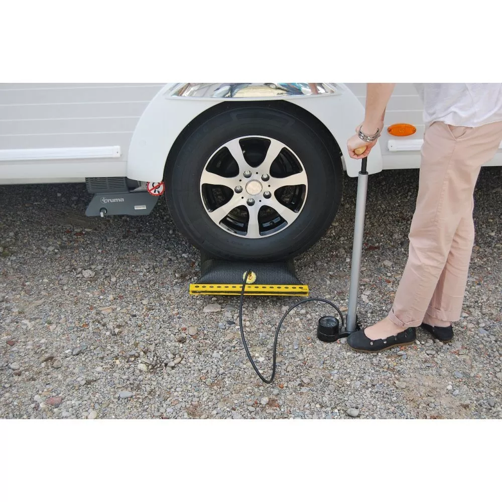 Die Handhabung ist sehr einfach und nimmt nur wenig Zeit in Anspruch. Das Ausgleichskissen wird einfach mit dem Ventil nach aussen zeigend unter dem anzuhebenden Rad platziert und mit Hilfe einer Hand-/Fusspumpe oder einem 12 Volt Minikompressor (nicht inklusive) ausnivelliert. So lange, bis Ihr Campingfahrzeug gerade steht. Eine Wasserwaage kann hier unterstützen.