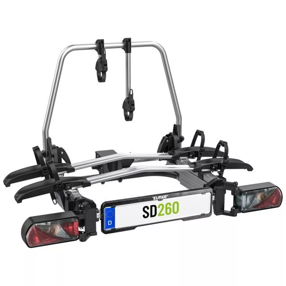 Du bist noch auf der Suche nach dem passenden Kupplungsträger für dein Wohnmobil, Campingbus, Hochdachkombi mit Flügeltür oder deinen Alltags-PKW? Dann ist der Fahrradträger Eufab SD260 genau die richtige Wahl! Denn dieser Träger ist nicht nur für den Transport von 2 Fahrrädern, sondern auch für E-Bikes, Oversize Velos und Rädern mit Y-Rahmen geeignet. Zudem ist dieser Heckträger mit Gleitschienen ausgestattet, welche die Öffnung von Türen mit bis zu 85 cm Breite ermöglichen – und das bei beladenem Veloträger!