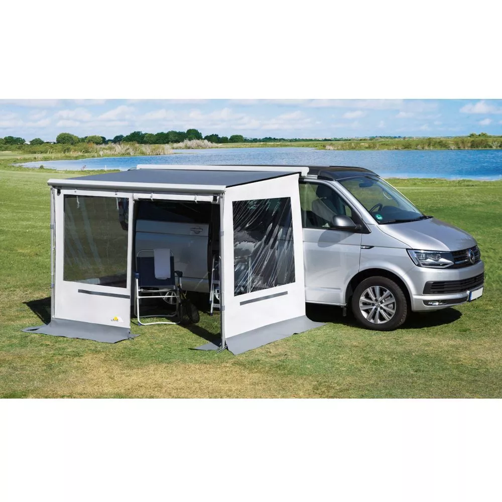 Wenn du eine optionale Vorderwand dazu wählst, hast du ein robustes Markisenvorzelt und bist gerüstet für jegliche Wetterlage. Damit das entstehende Markisenvorzelt auch optimal mit dem Fahrzeug verbunden ist, können optional erhältliche Schaumstoffwulste und Andruckstangen fahrzeugseitig ergänzt werden. Um Seitenwände und die optionale Vorderwand verbinden zu können, ist ein optionaler Verbindungsadapter notwendig.