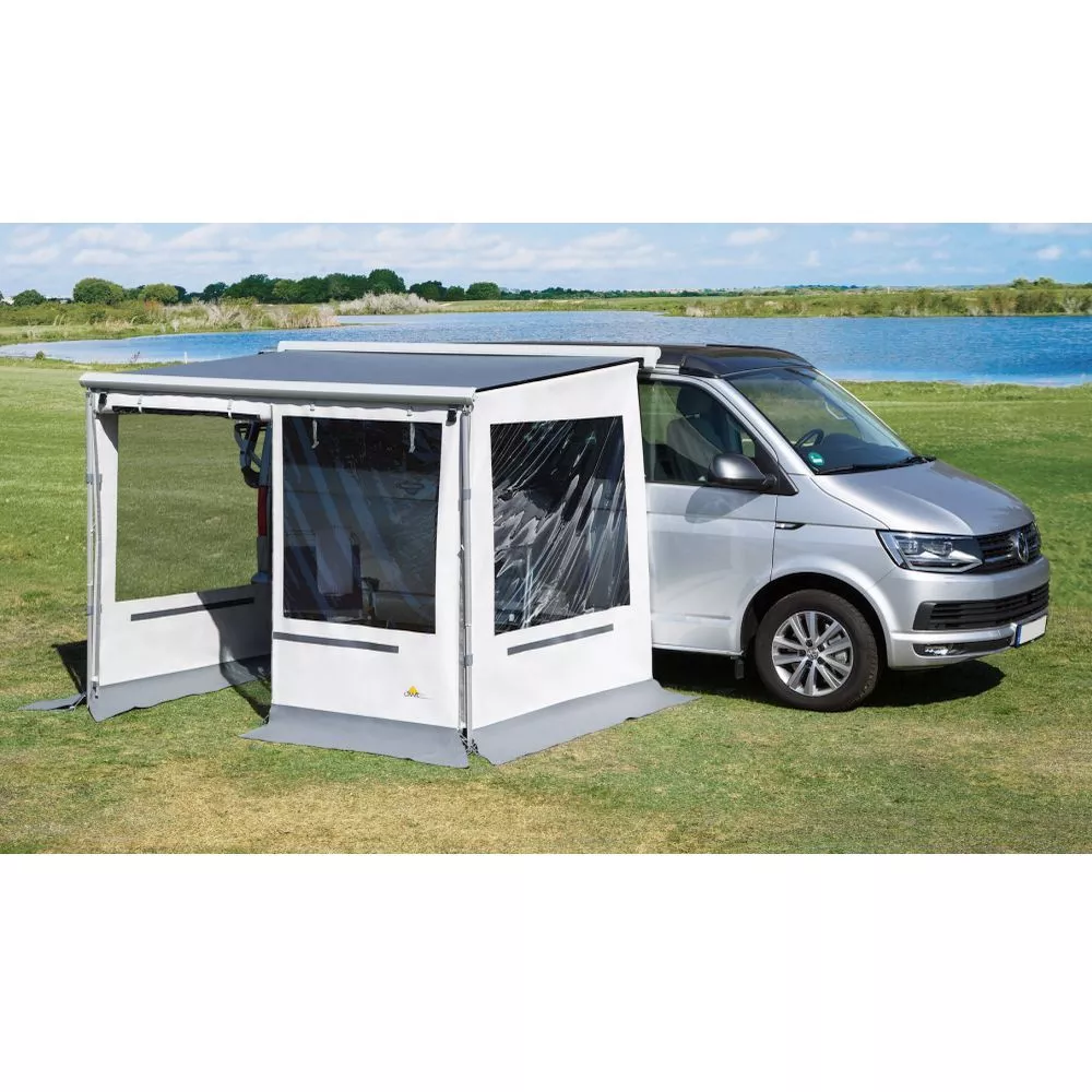 Die Rain Outside Seitenwand von DWT ist speziell ausgelegt für Campingbusse wie VW T5, T6, Ford Nugget, Mercedes V-Klasse und viele andere Modelle. Sie ist passend für deine Thule Omnistor (4900, 5102) und Fiamma Markise (F40 Van). Mittels mitgelieferter Spannstange wird sie zwischen Markisenkasten und Ausfallprofil gespannt. Mit dem mitgelieferten Anspressgurt fügt sich die Markisenseitenwand perfekt an dein Fahrzeug an.