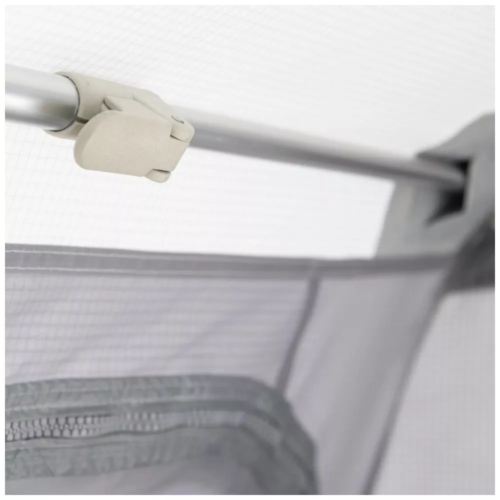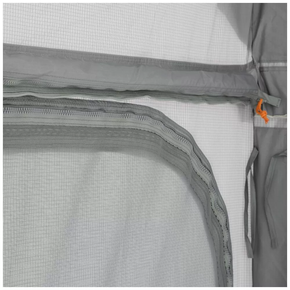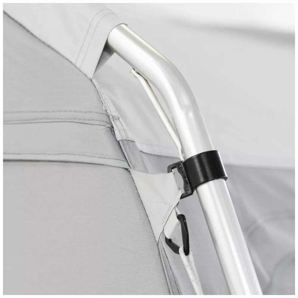 Die Seitenteile sind mit Reissverschlüssen versehen, um sie komplett zu öffnen oder beispielsweise einen optionalen Seitenanbau zu befestigen. Ausserdem können die Frontteile seitlich weggerollt oder ebenfalls komplett heraus genommen werden. So kannst du immer genügend Frischluft in den Wohnbereich lassen.