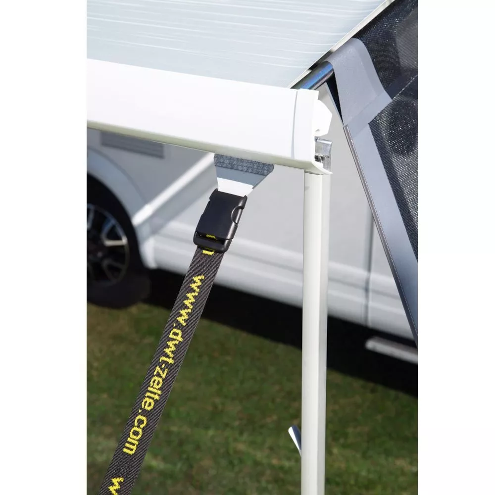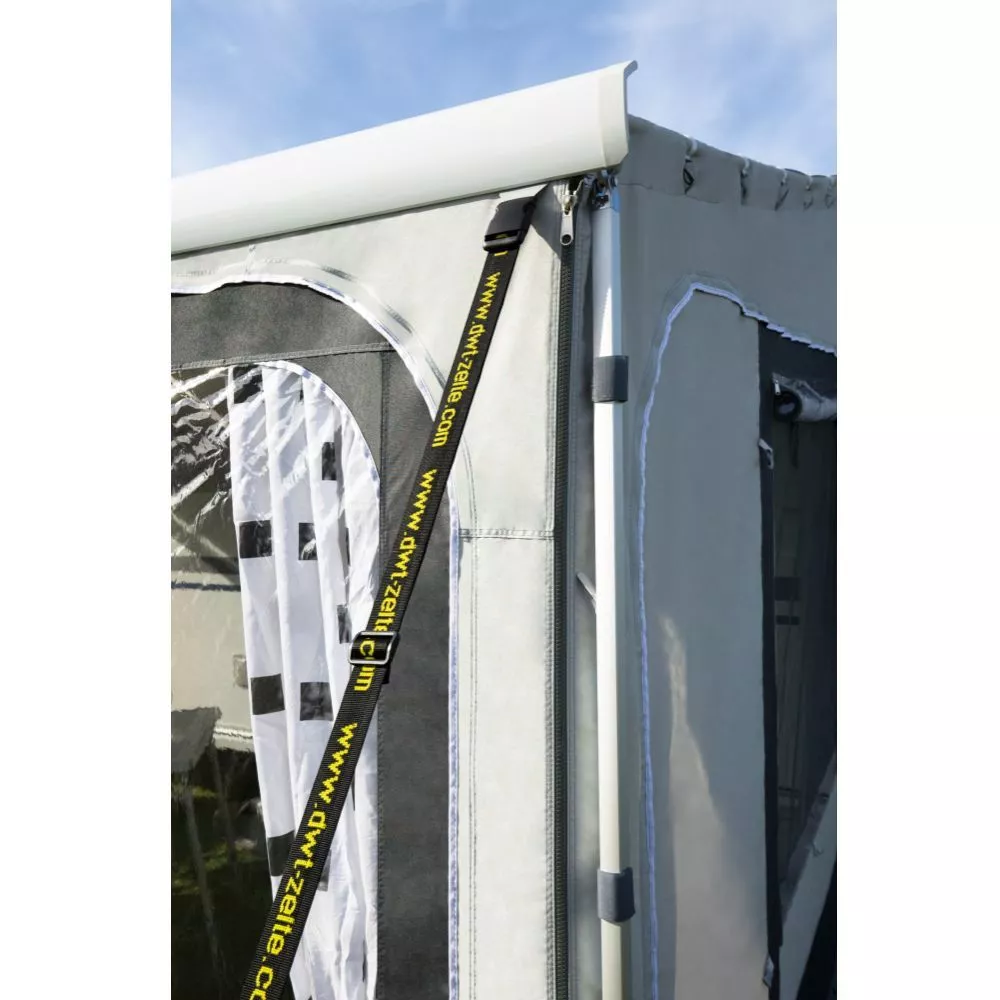 Wenn du optionale Seitenwände dazu wählst, hast du ein robustes Markisenvorzelt und bist gerüstet für jegliche Wetterlage. Passende Abspannmaterialien sind bereits im Lieferumfang enthalten.