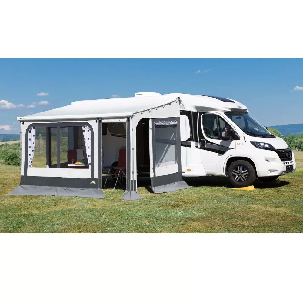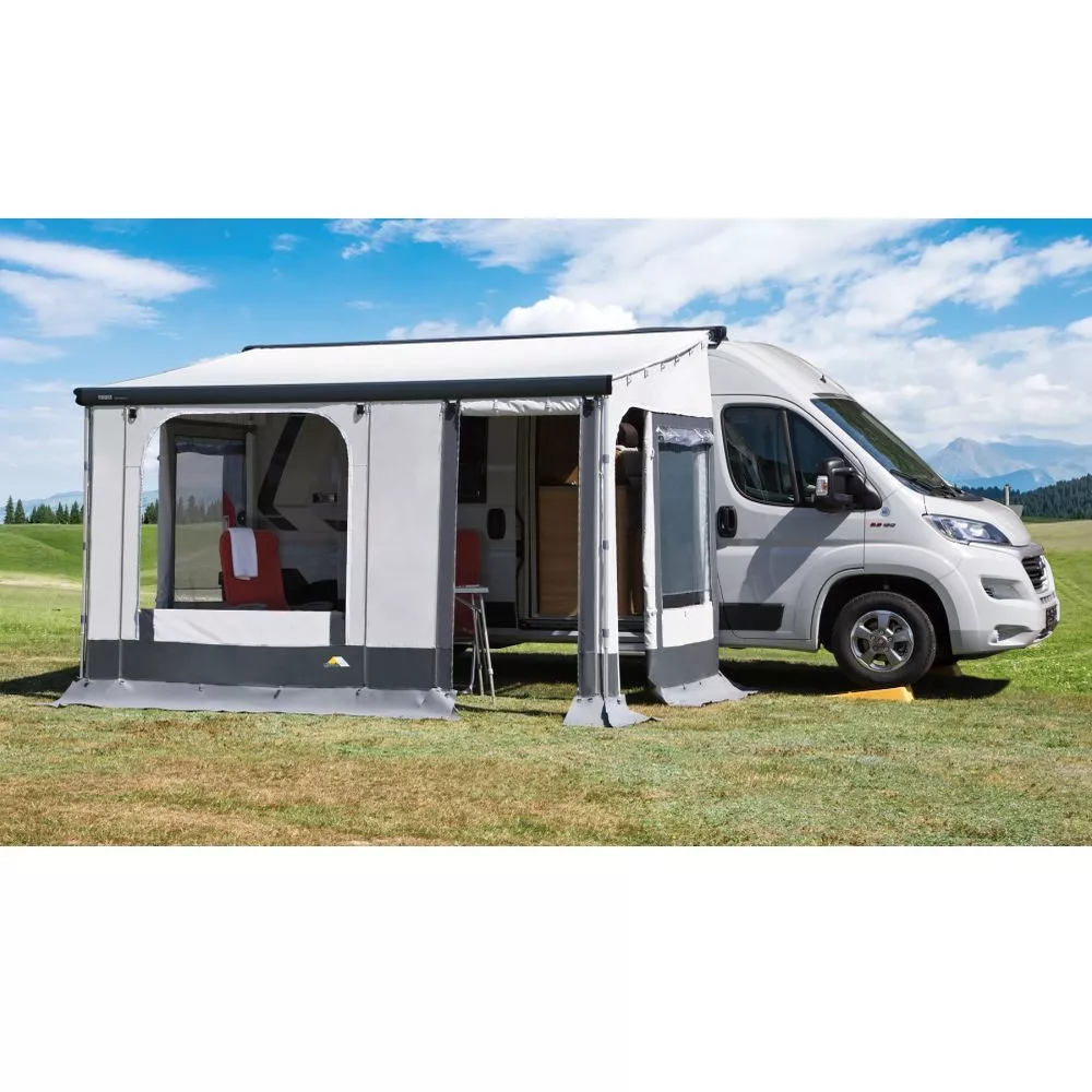 Die Markisensvorderwand besteht aus leichtem, atmungsaktivem und lichtechtem trailtex-Polyestergewebe und hält Regen, aber auch Sonne fern. Das Grundelement besitzt ein grosses Panorama-Fenster, dass sich bei Bedarf per Reissverschluss zu einer Veranda abklappen lässt. Ausserdem ist wahlweise rechts oder links eine Eingangstür eingearbeitet, die sich komplett hochrollen lässt. Optional kannst du dir mehrere Erweiterungselemente dazu kaufen, die mit dem Grundelement verbunden werden können. So kannst du auf diese auf das gewünschte Mass deiner Markise (Länge = Markisenbezeichnung) anpassen.