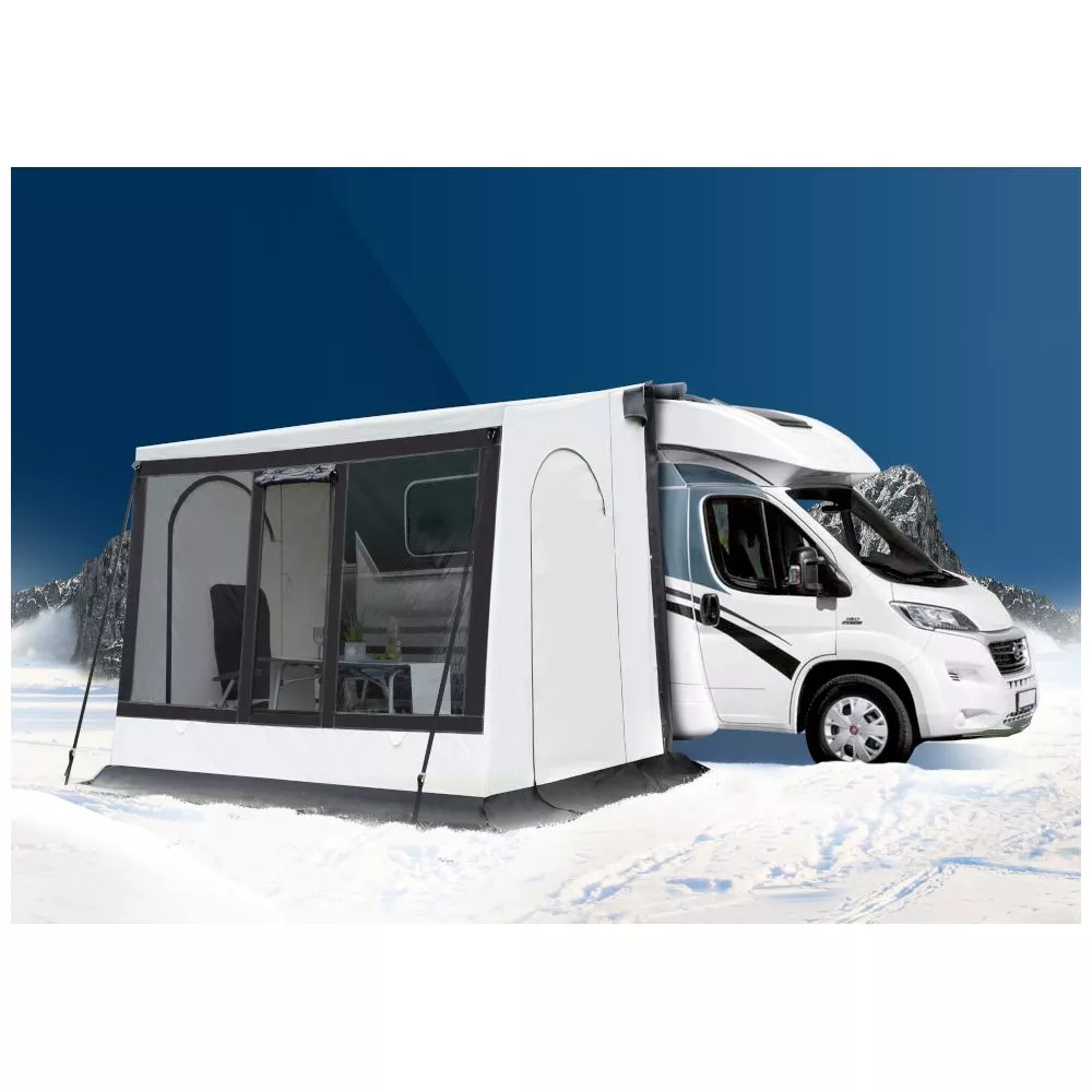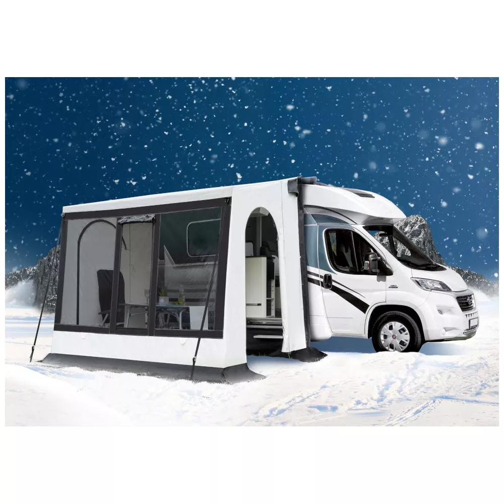 Schlechtes Wetter? Wigo bietet dir mit dem freistehenden Inuit Blizzard genau das passende Vorzelt! – Wintercamping ist wirklich nichts für Weicheier. Dennoch muss die Ausrüstung stimmen und mit diesem Wintervorzelt machst du in jedem Fall alles richtig. Seine Anstellhöhe von bis zu 298 cm ermöglicht dir dieses Teilzelt auch an grösseren Reisemobilen oder Kastenwagen aufzubauen.